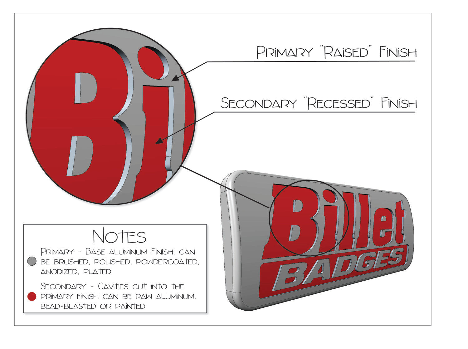 Every one of our badges are made out of high grade T-6061 solid billet aluminum. The metal surface can be processed in a variety of methods to create just the look your after. Our standard finishes can be seen in the gallery below.