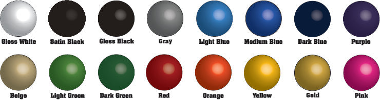 You can add just about any color you want to your custom ordered Billet Badge. We use only genuine automotive paint to color the recessed cavities or background portions of a custom design. Our standard colors are depicted below and we are happy to have custom or OEM colors mixed for an additional fee.